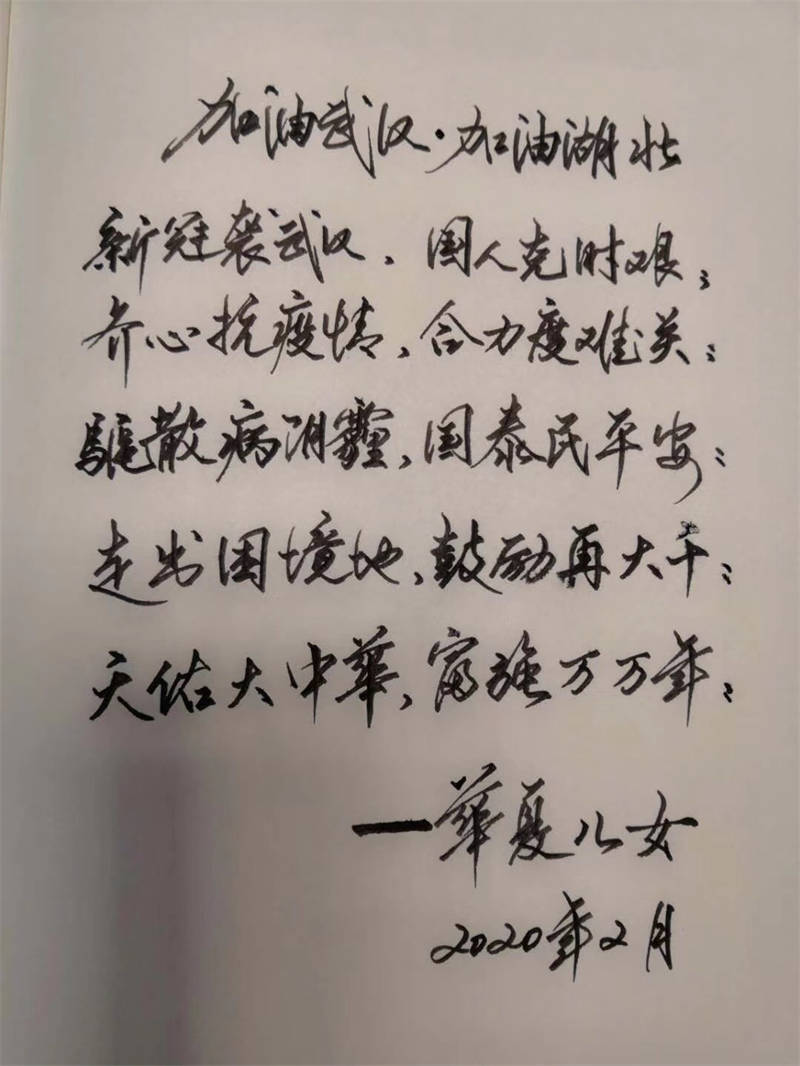 紙短情長(zhǎng)述不盡心中敬意,以詩(shī)傳情道不盡心中謝意,詩(shī)詞歌賦雖不能驅(qū)散冠狀病毒,但能帶給人們百折不撓的勇氣和必勝的信心。以筆為槍能“齊心抗疫情,合力度難關(guān)”,以詩(shī)傳情能“驅(qū)散病陰霾,國(guó)泰民平安”,以筆墨應(yīng)援能用筆觸的溫度,溫暖那些戰(zhàn)役中英雄。