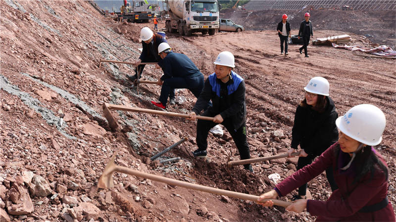 在活動現(xiàn)場,工程部部長劉太亮給大家介紹了雨名快速通道項目建設(shè)情況,高邊坡支護(hù)班組相關(guān)負(fù)責(zé)人現(xiàn)場指導(dǎo)高邊坡支護(hù)防護(hù)工作。全體黨員、入黨積極分子和公司其他員工在工程管理人員指導(dǎo)下,揮鎬舞鋤,積極參與勞動體驗。