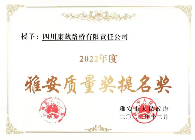 交建路橋獲“2022 年度雅安質(zhì)量獎(jiǎng)提名獎(jiǎng)” 榮譽(yù)稱號(hào)