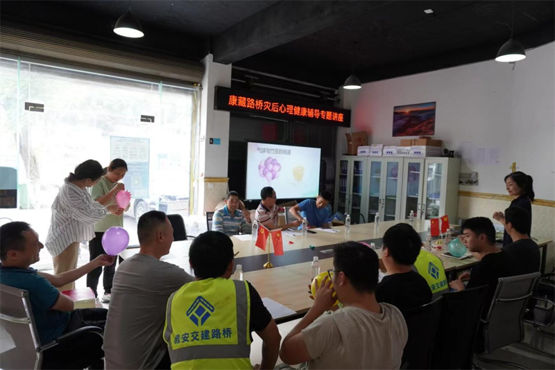 “6.1”蘆山地震發(fā)生后,路橋公司寶興項目部員工親身經(jīng)歷了全過程,第一時間組織人力、物力參加人員道路搶通保通和生產(chǎn)自救,突發(fā)地震災(zāi)害對職工造成不同程度的心理沖擊;顒又,左老師與員工們歡聚一堂,以小游戲與員工互動調(diào)整大家心理狀態(tài),圍繞員工心理健康常識、常見心理困擾及應(yīng)對策略和如何緩解工作壓力、控制個人情緒、提高心理健康水平等內(nèi)容,評估員工心理健康狀況,剖析員工情緒現(xiàn)狀及負面情緒產(chǎn)生的原因,幫助梳理解決方案。