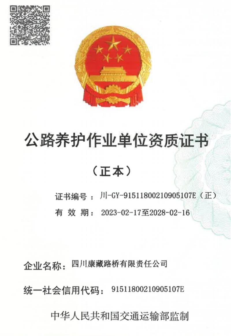 四川康藏路橋有限責(zé)任公司取得路基路面養(yǎng)護乙級資質(zhì)