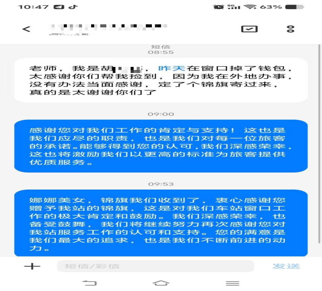 5月14日11時(shí)11分,售票員郝凌云發(fā)現(xiàn)柜臺上遺留了一個(gè)卡包,內(nèi)有現(xiàn)金 300 元、多張銀行卡、身份證及社?ǖ戎匾锲贰:铝柙频谝粫r(shí)間上報(bào)值班科長,通過站務(wù)系統(tǒng)比對購票信息,僅用5分鐘便鎖定失主為即將前往漢源的旅客胡女士,此時(shí)胡女士正在等待檢票,尚未察覺錢包丟失。值班站長通過廣播系統(tǒng)緊急尋人,胡女士聽到廣播后立即前往值班室認(rèn)領(lǐng)物品,經(jīng)值班科長仔細(xì)核對身份及物品信息后,將卡包完好歸還。胡女士激動致謝:“太感謝你了!你們汽車站的工作人員素質(zhì)真高,太讓人暖心了!”