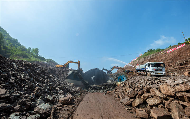 上午10點,金雞關(guān)隧道開挖現(xiàn)場,多臺大型破碎機和灑水除塵設(shè)備同時按下啟動鍵,建設(shè)的“沖鋒號”奏響。金雞關(guān)隧道開挖是整個項目取得突破性進展的標(biāo)志,是路基鋪設(shè)和邊坡抗滑裝等施工開展的基礎(chǔ)。目前土方開挖已完成365萬方,邊坡施工已完成8級,項目整體推進有序,預(yù)計兩個月完成隧道部分開挖。