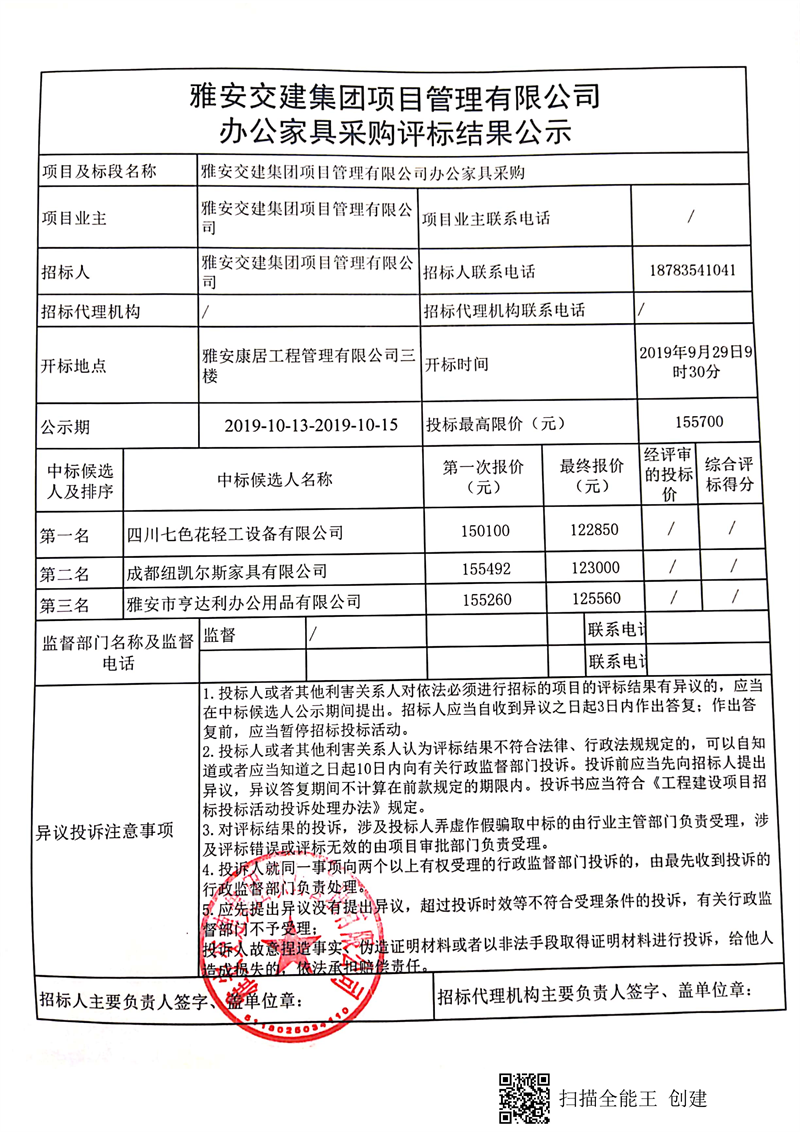 雅安交建集團(tuán)項(xiàng)目管理有限公司辦公家具采購(gòu)評(píng)標(biāo)結(jié)果公示