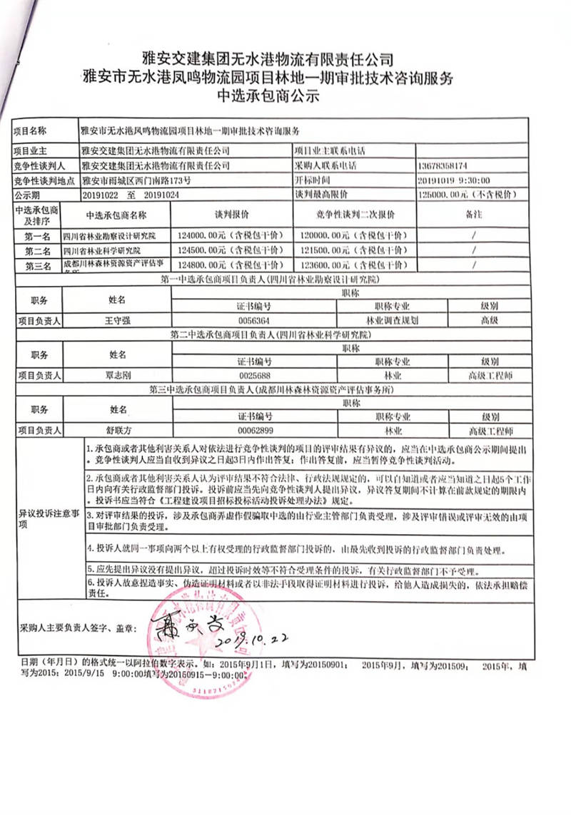 雅安交建集團(tuán)無(wú)水港物流有限責(zé)任公司雅安市無(wú)水港鳳鳴物流園項(xiàng)目林地一期審批技術(shù)咨詢服務(wù)中選承包商公示