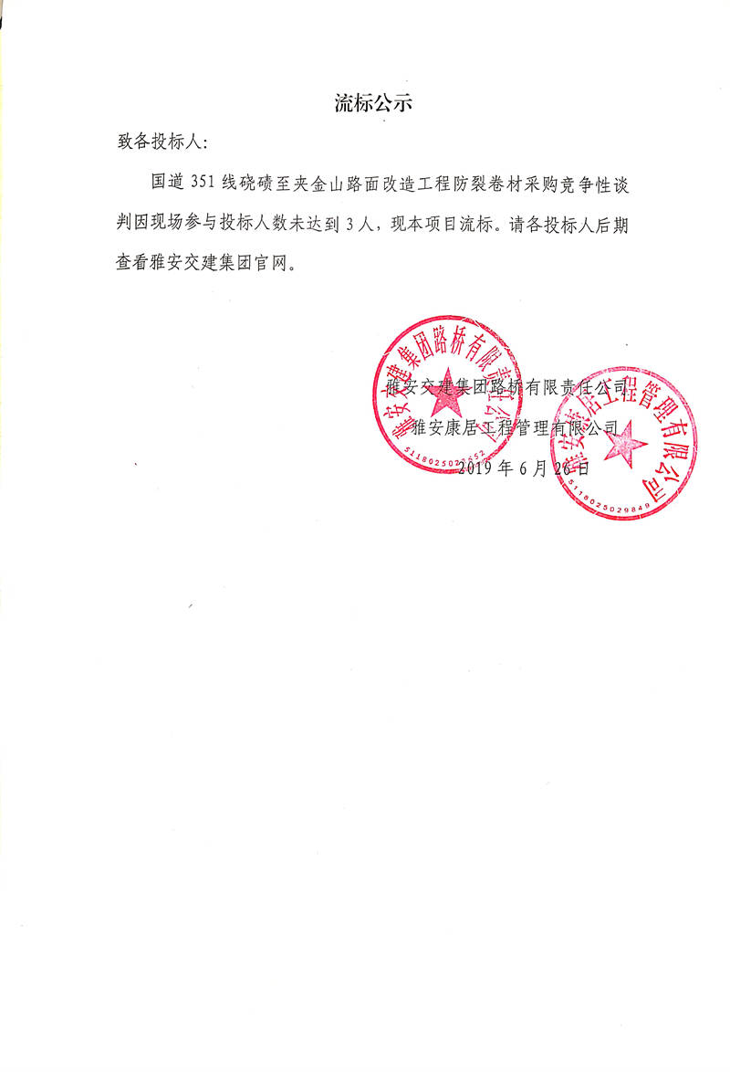 雅安交建集團(tuán)路橋有限責(zé)任公司國道351線磽磧至夾金山路面改造工程防裂卷材采購競(jìng)爭(zhēng)性談判流標(biāo)公示