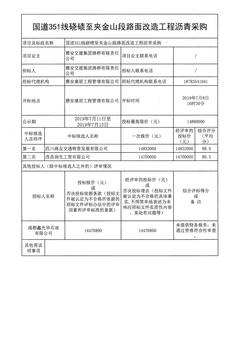 雅安交建集團路橋有限責(zé)任公司國道351線磽磧至夾金山段路面改造工程瀝青采購公開招標(biāo)結(jié)果公示