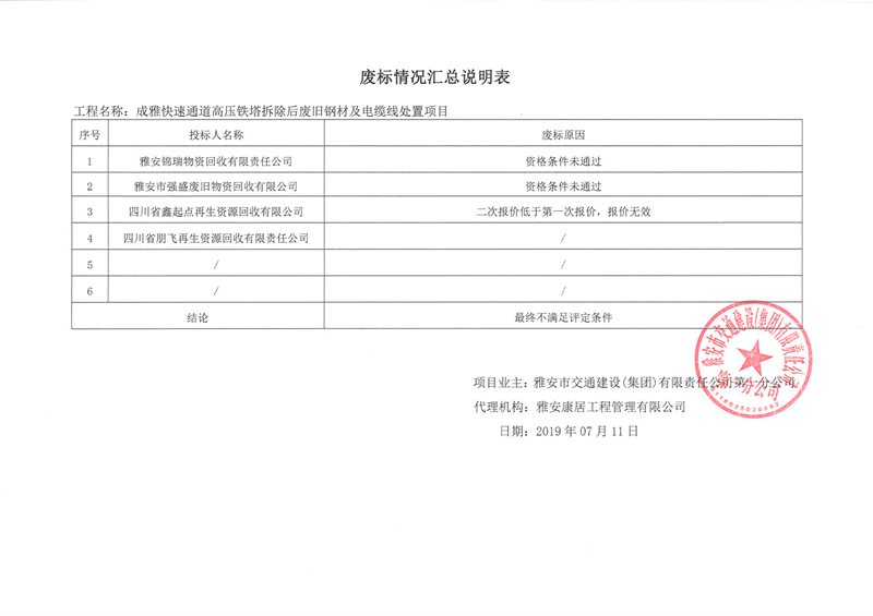雅安市交通建設(集團)有限責任公司第一分公司成雅快速通道高壓鐵塔拆除后廢舊鋼材及電纜線處置項目廢標情況匯總說明表