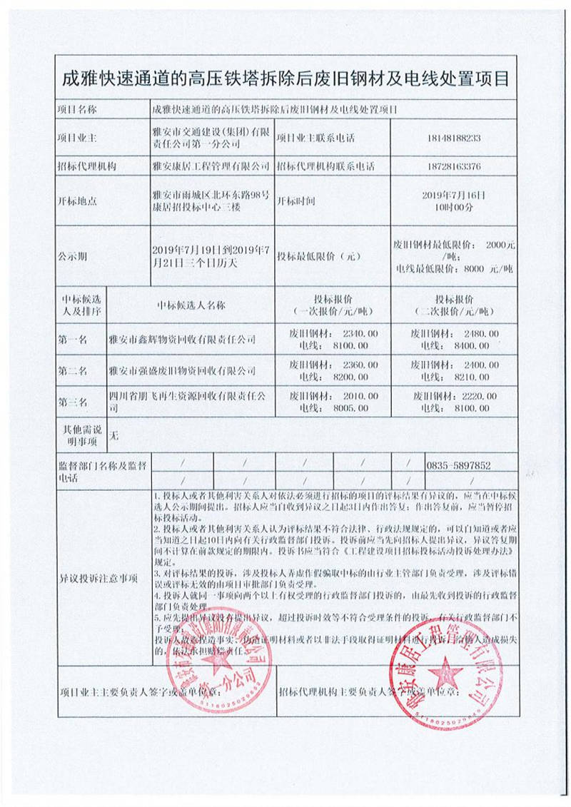 雅安市交通建設(集團)有限責任公司第一分公司成雅快速通道的高壓鐵塔拆除后廢舊鋼材及電線處置項目競價結(jié)果公示