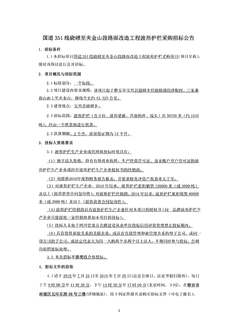 雅安交建集團(tuán)路橋有限責(zé)任公司國道351線磽磧至夾金山段路面改造工程波形護(hù)欄采購招標(biāo)公告