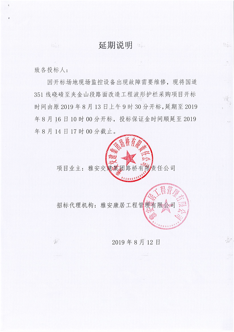 雅安交建集團(tuán)路橋有限責(zé)任公司國(guó)道351線磽磧至夾金山段路面改造工程波形護(hù)欄采購(gòu)延期說明