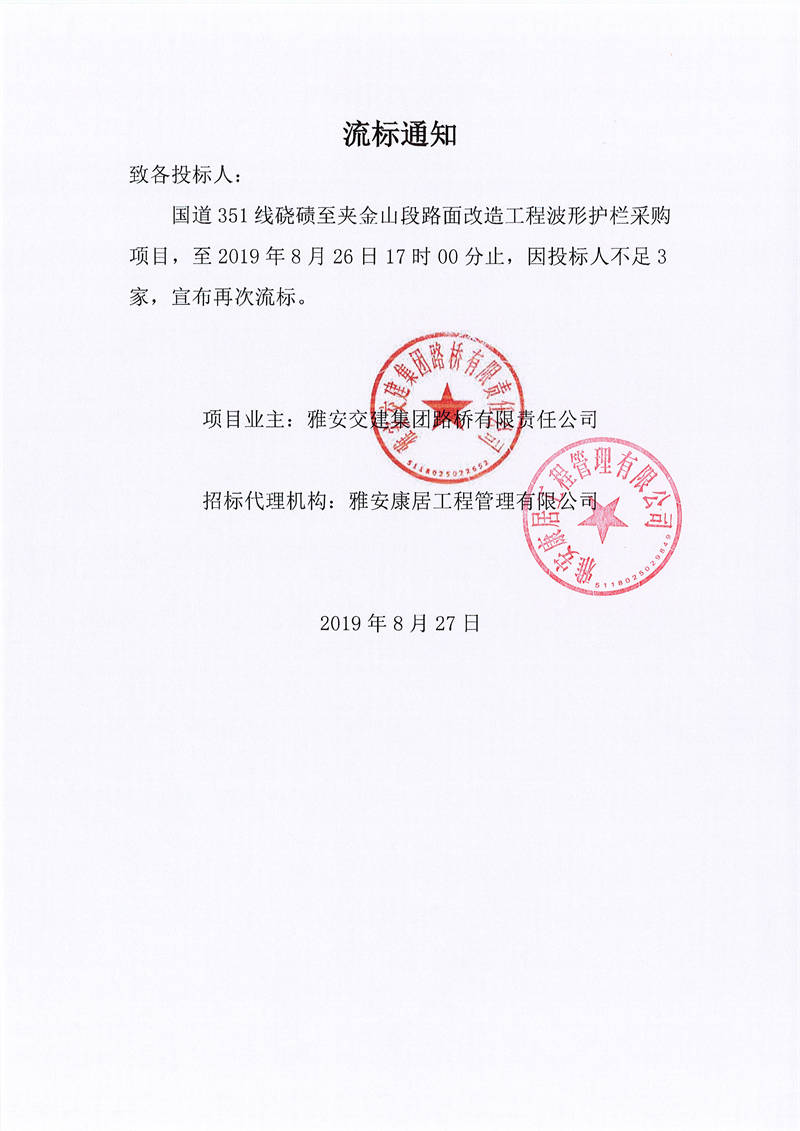 雅安交建集團路橋有限責(zé)任公司國道351線蹺磧至夾金山段路面改造工程波形護欄采購項目流標通知