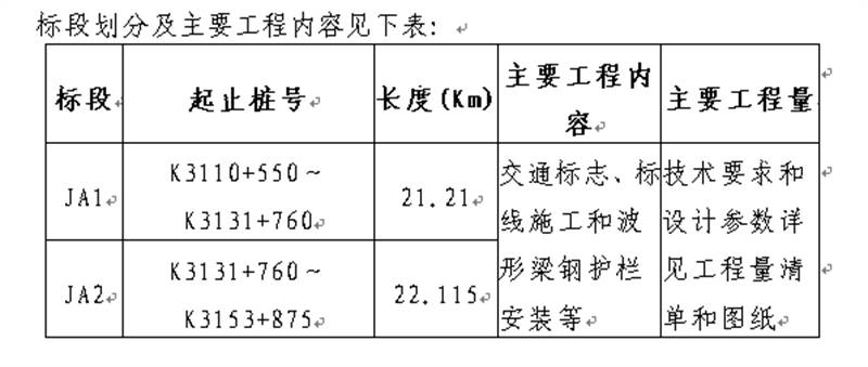 2.2招標(biāo)范圍:本次招標(biāo)范圍為國(guó)道351線(xiàn)磽磧至夾金山路面改造工程公路安全設(shè)施施工標(biāo)段招標(biāo),工程內(nèi)容包括:全線(xiàn)交通標(biāo)志、交通標(biāo)線(xiàn)、里程碑、百米樁、公路界碑施工和波形梁鋼護(hù)欄安裝等。