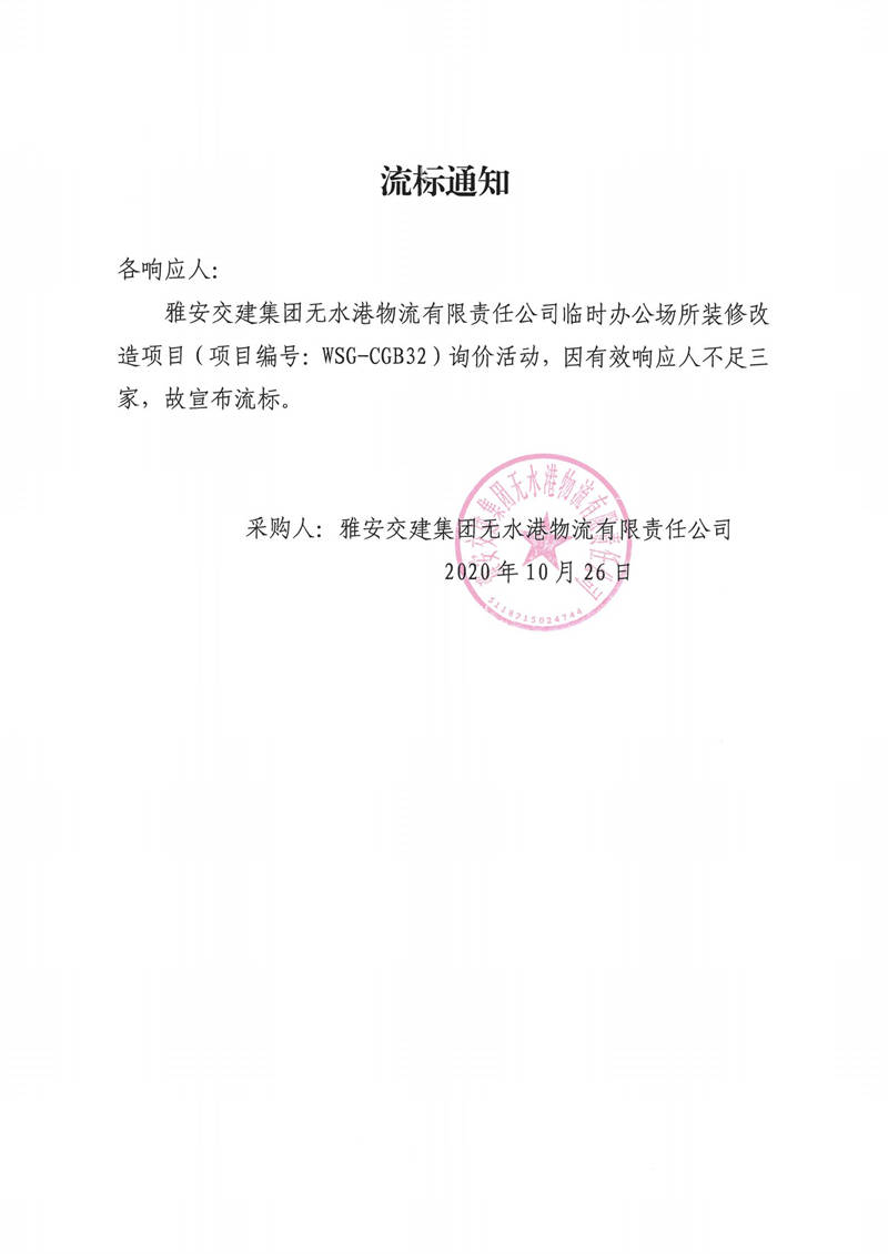 雅安交建集團(tuán)無水港物流有限責(zé)任公司臨時辦公場所裝修改造項目流標(biāo)通知