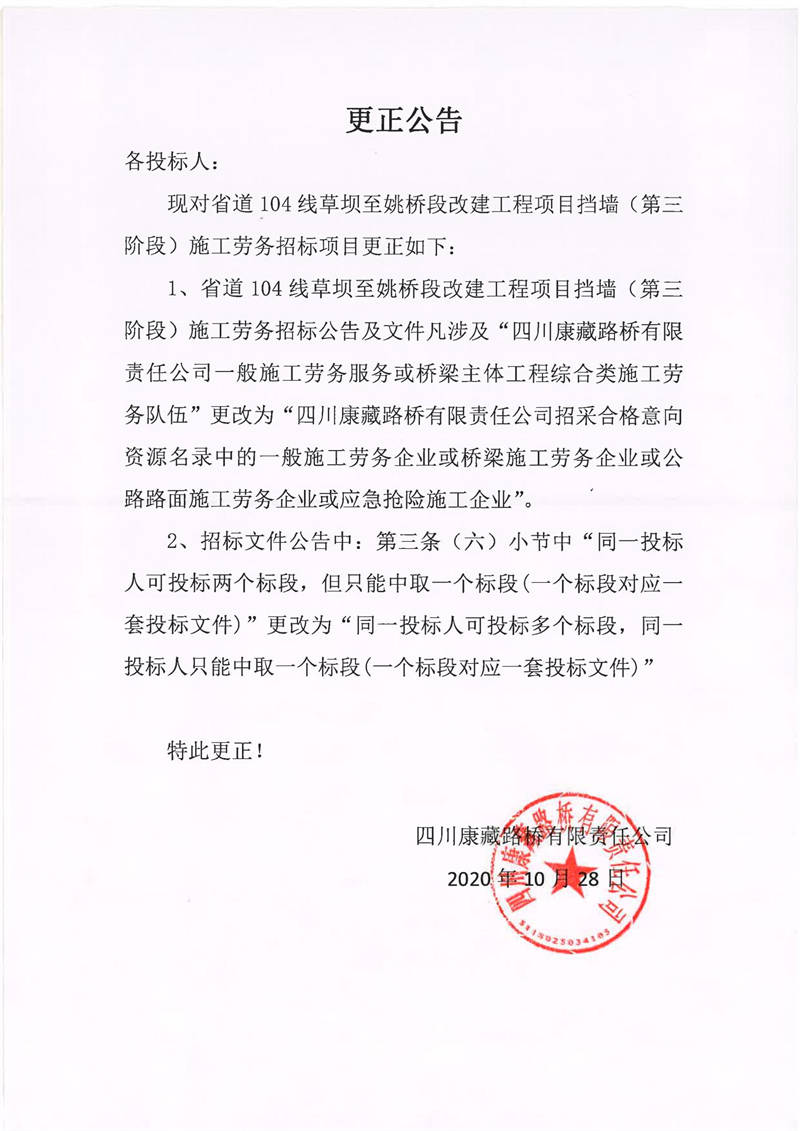 四川康藏路橋有限責(zé)任公司省道104線草壩至姚橋段改建工程項目擋墻(第三階段)施工勞務(wù)招標項目更正公告