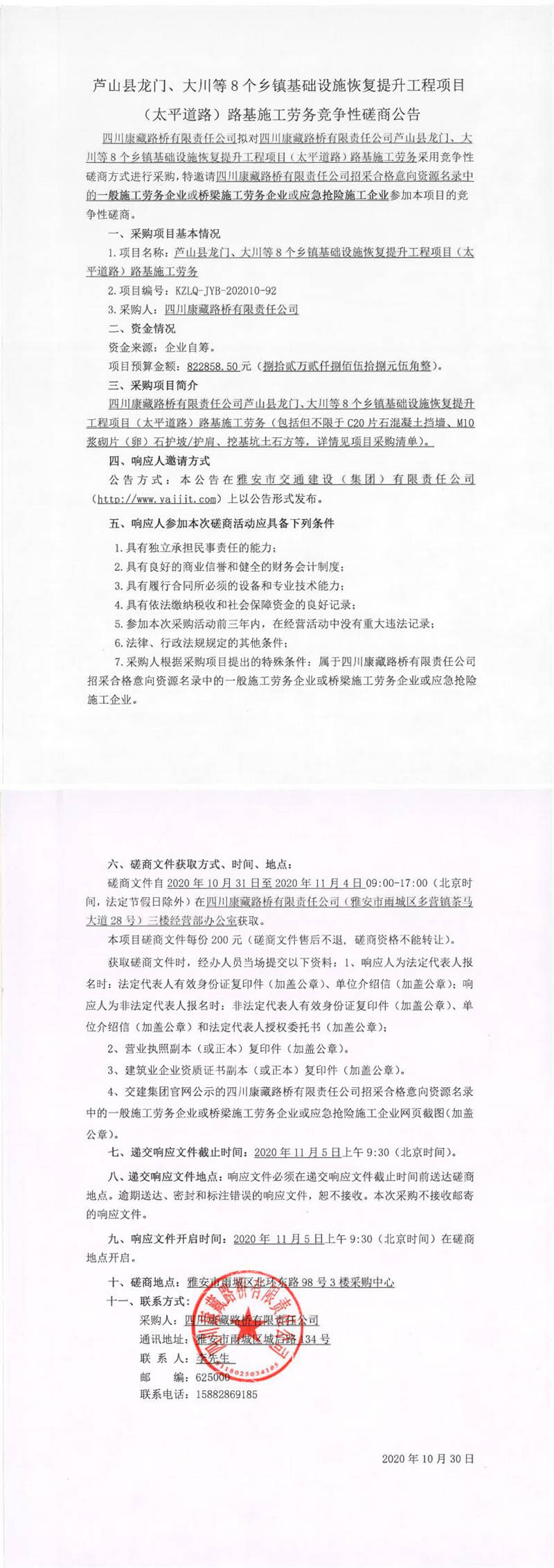 四川康藏路橋有限責(zé)任公司蘆山縣龍門、大川等8個鄉(xiāng)鎮(zhèn)基礎(chǔ)設(shè)施恢復(fù)提升工程項目(太平道路)路基施工勞務(wù)競爭性磋商公告