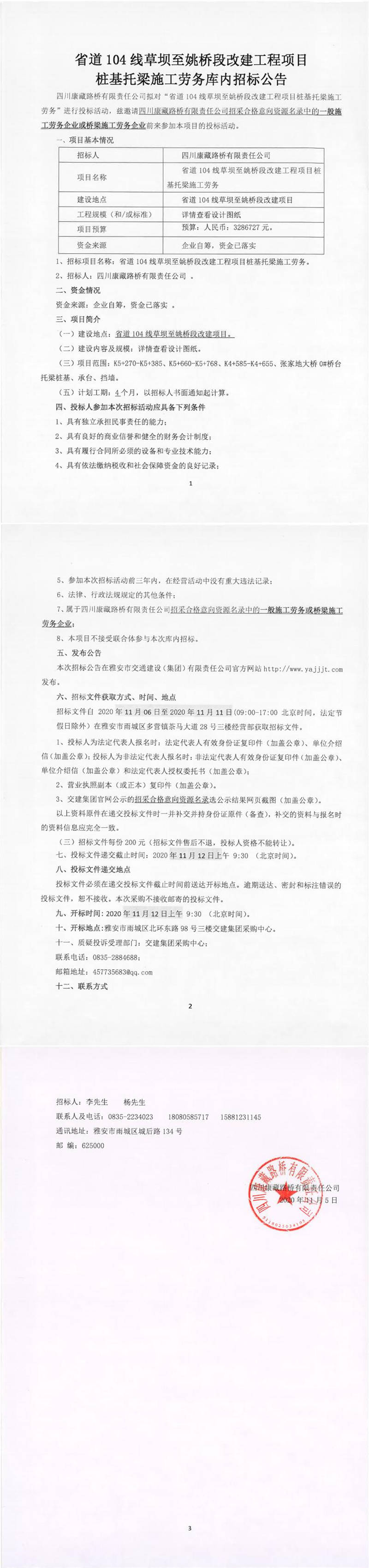 四川康藏路橋有限責(zé)任公司省道104線草壩至姚橋段改建工程項目樁基托梁施工勞務(wù)庫內(nèi)招標(biāo)公告