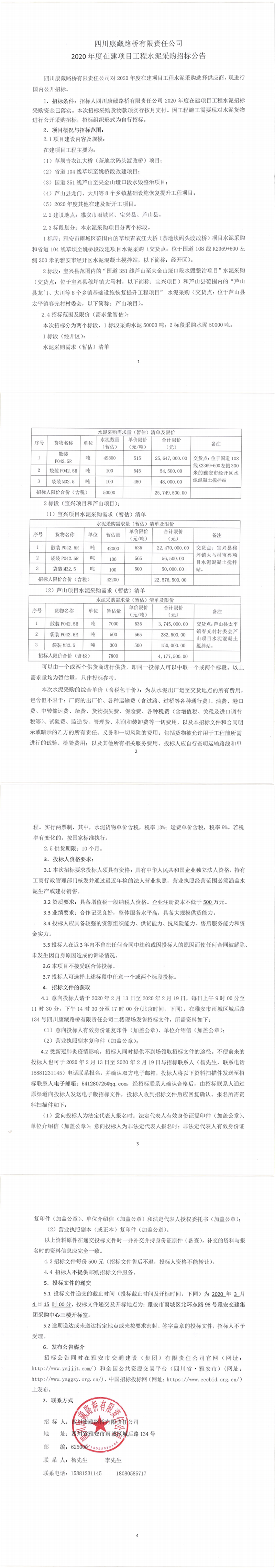 四川康藏路橋有限責(zé)任公司2020年度在建項(xiàng)目工程水泥采購(gòu)招標(biāo)公告