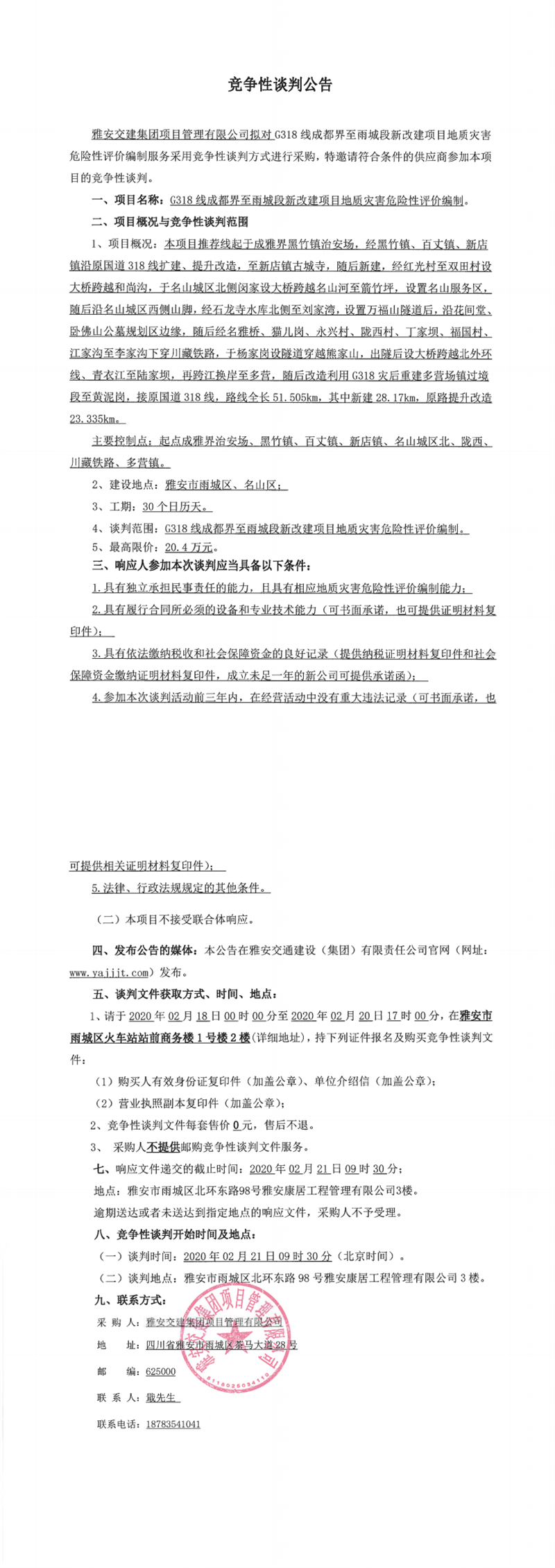 雅安交建集團(tuán)項(xiàng)目管理有限公司G318線成都界至雨城段新改建項(xiàng)目地質(zhì)災(zāi)害危險(xiǎn)性評(píng)價(jià)編制競爭性談判公告