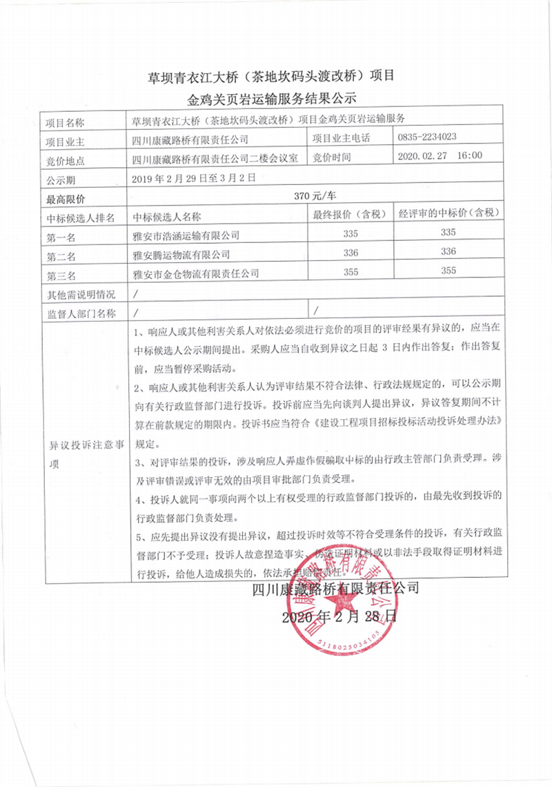 四川康藏路橋有限責(zé)任公司草壩青衣江大橋(茶地坎碼頭渡改橋)項(xiàng)目金雞關(guān)頁(yè)巖運(yùn)輸服務(wù)結(jié)果公示