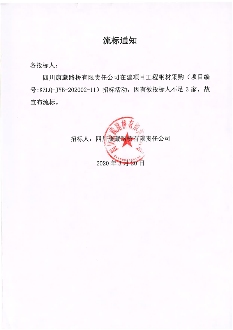 四川康藏路橋有限責(zé)任公司在建項(xiàng)目工程鋼材采購(gòu)流標(biāo)通知