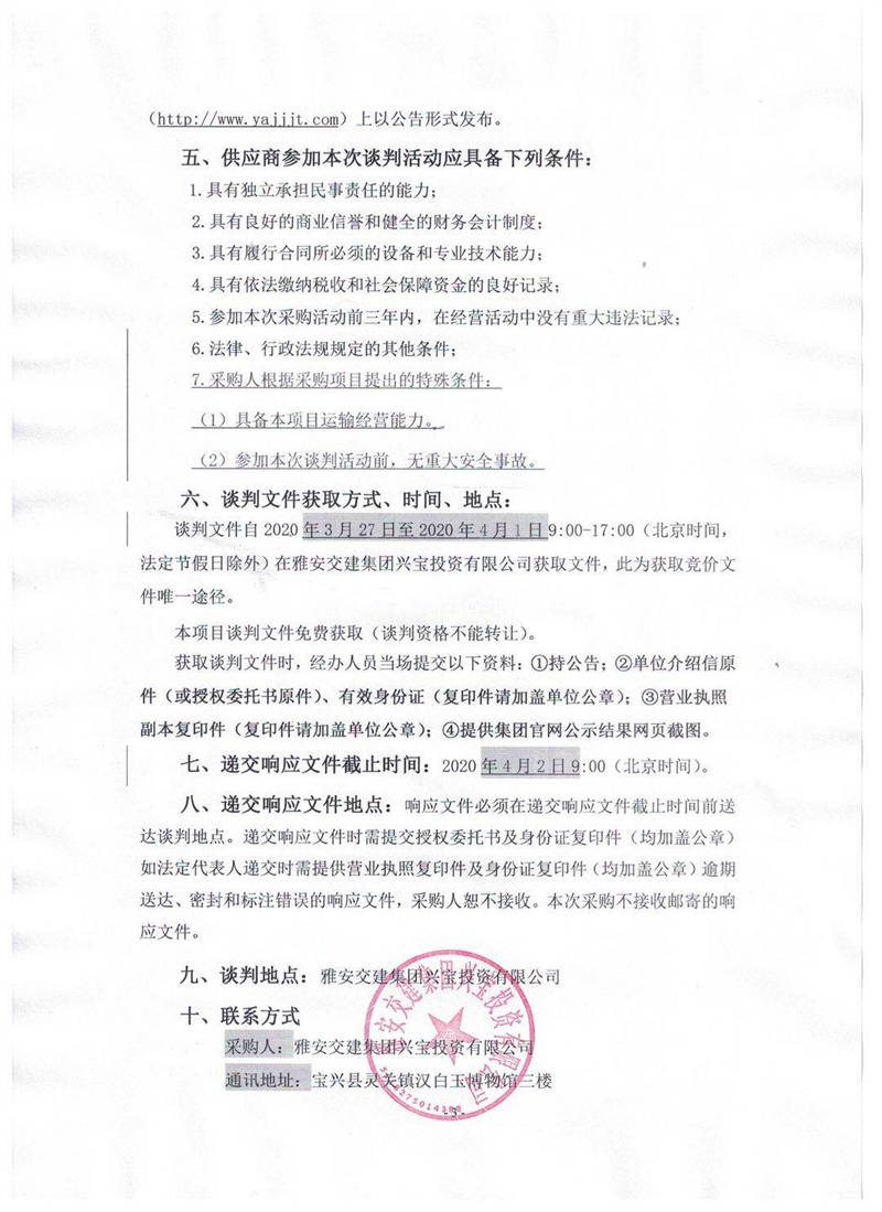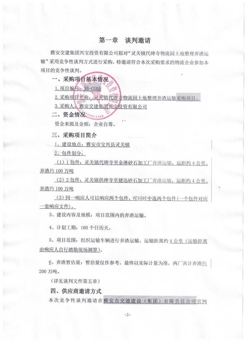 雅安交建集團(tuán)興寶投資有限公司靈關(guān)鎮(zhèn)代碑寺物流園土地整理?xiàng)壴\(yùn)輸采購(gòu)項(xiàng)目競(jìng)爭(zhēng)性談判公告