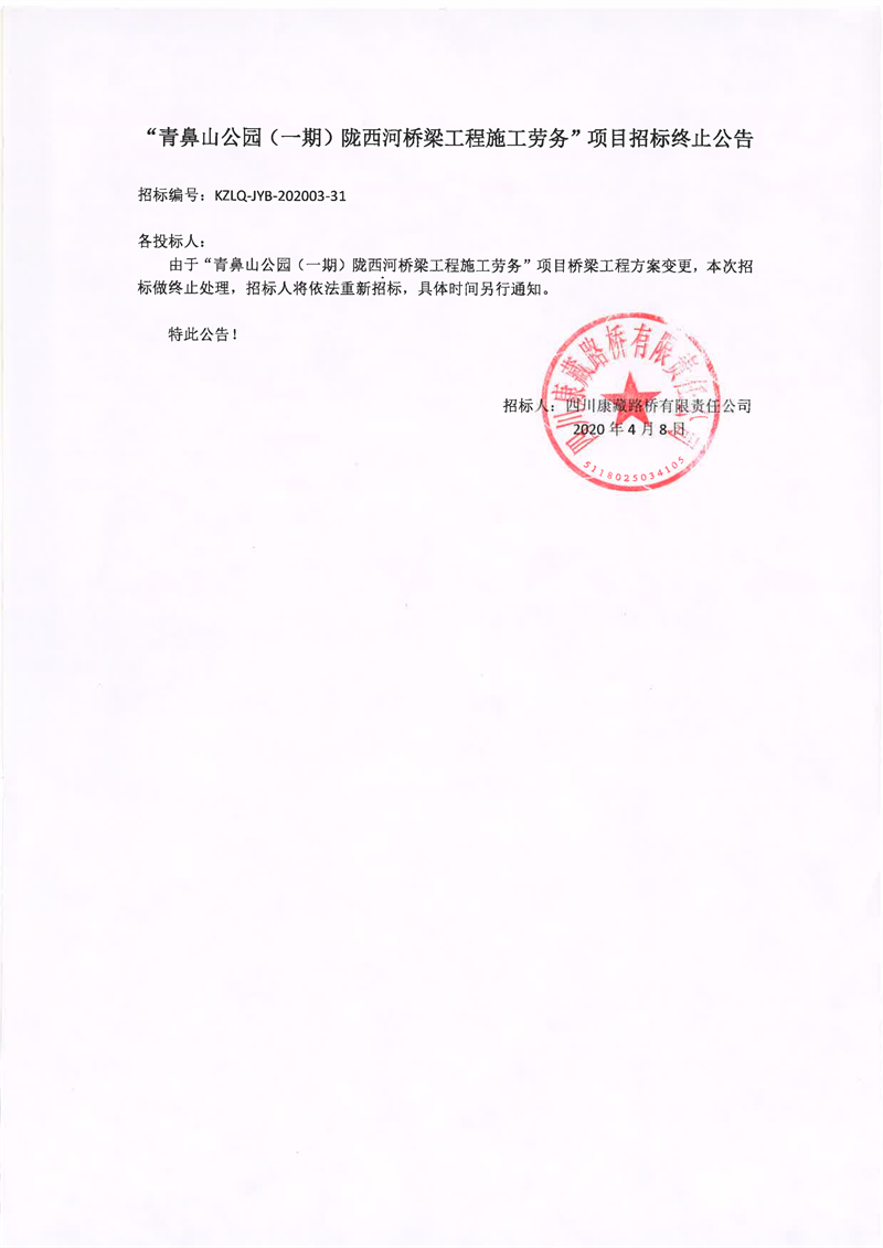 四川康藏路橋有限責任公司青鼻山公園(一期)隴西河橋梁工程施工勞務(wù)項目招標終止公告