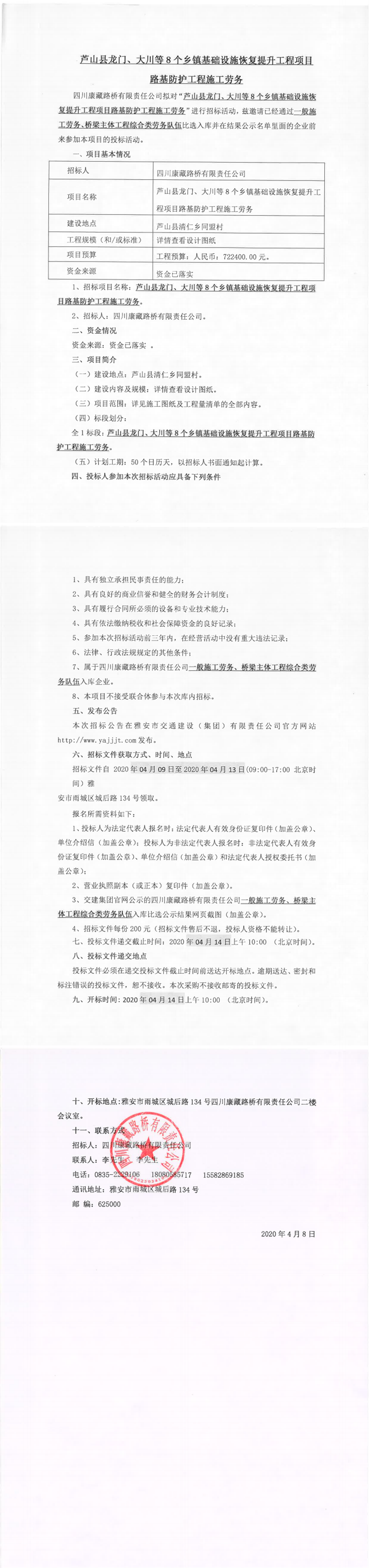 四川康藏路橋有限責(zé)任公司蘆山縣龍門、大川等8個鄉(xiāng)鎮(zhèn)基礎(chǔ)設(shè)施恢復(fù)提升工程項目路基防護(hù)工程施工勞務(wù)招標(biāo)公告