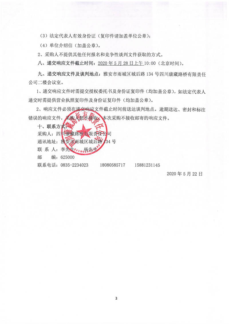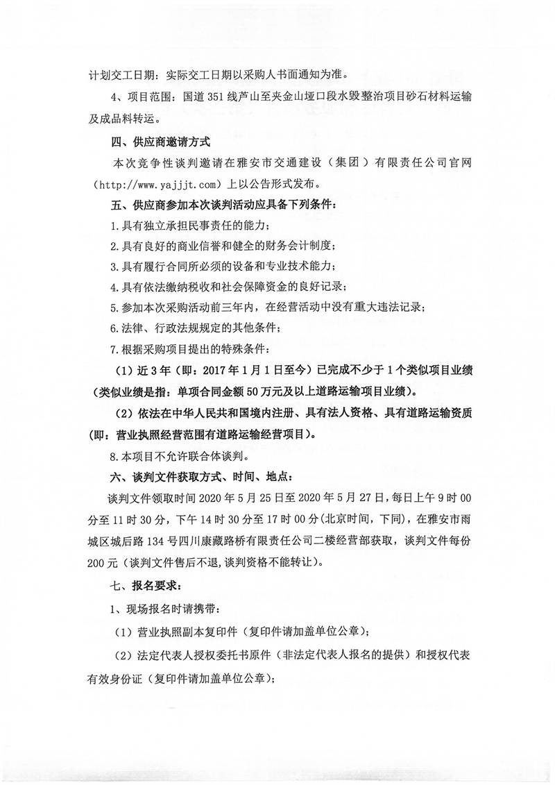 四川康藏路橋有限責(zé)任公司國道351線蘆山至夾金山埡口段8.22水毀項(xiàng)目砂石材料運(yùn)輸服務(wù)項(xiàng)目(第三次)談判公告