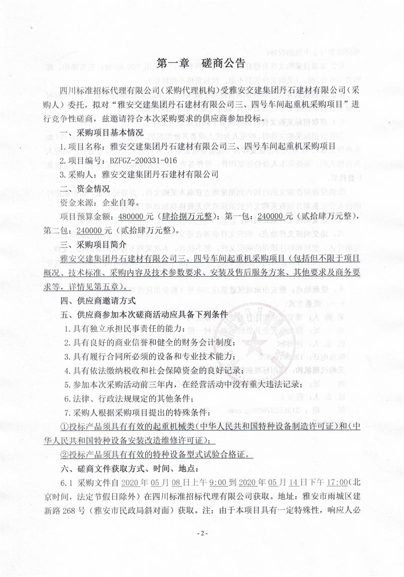 雅安交建集團丹石建材有限公司三、四號車間起重機采購項目競爭性磋商公告