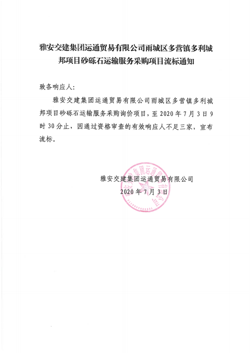 雅安交建集團運通貿(mào)易有限公司雨城區(qū)多營鎮(zhèn)多利城邦項目砂礫石運輸服務(wù)采購項目流標(biāo)通知