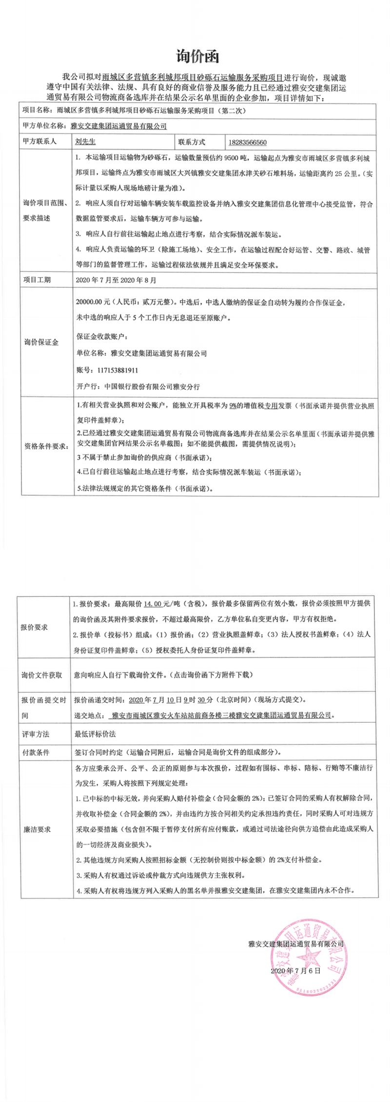 雅安交建集團運通貿(mào)易有限公司雨城區(qū)多營鎮(zhèn)多利城邦項目砂礫石運輸服務采購項目(第二次)詢價函