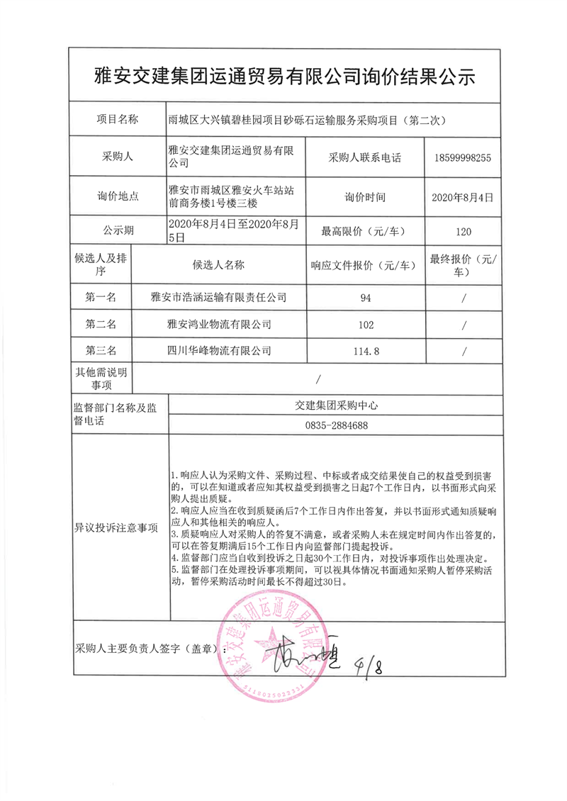 雅安交建集團(tuán)運(yùn)通貿(mào)易有限公司雨城區(qū)大興鎮(zhèn)碧桂園項(xiàng)目砂礫石運(yùn)輸服務(wù)采購(gòu)項(xiàng)目(第二次)詢價(jià)結(jié)果公示