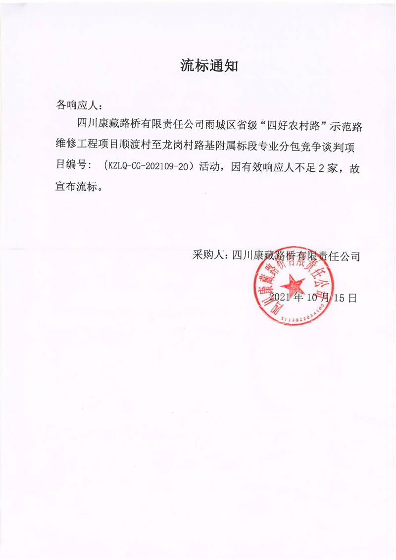 四川康藏路橋有限責(zé)任公司雨城區(qū)省級(jí)“四好農(nóng)村路”示范路維修工程項(xiàng)目順渡村至龍崗村路基附屬標(biāo)段專業(yè)分包流標(biāo)通知