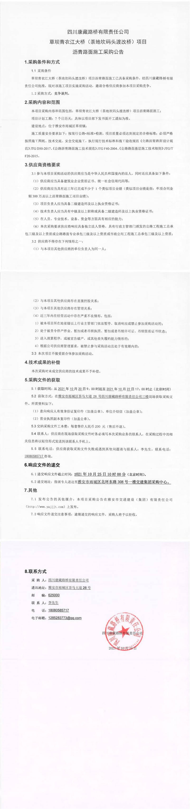 四川康藏路橋有限責(zé)任公司草壩青衣江大橋(茶地坎碼頭渡改橋)項目瀝青路面施工采購公告