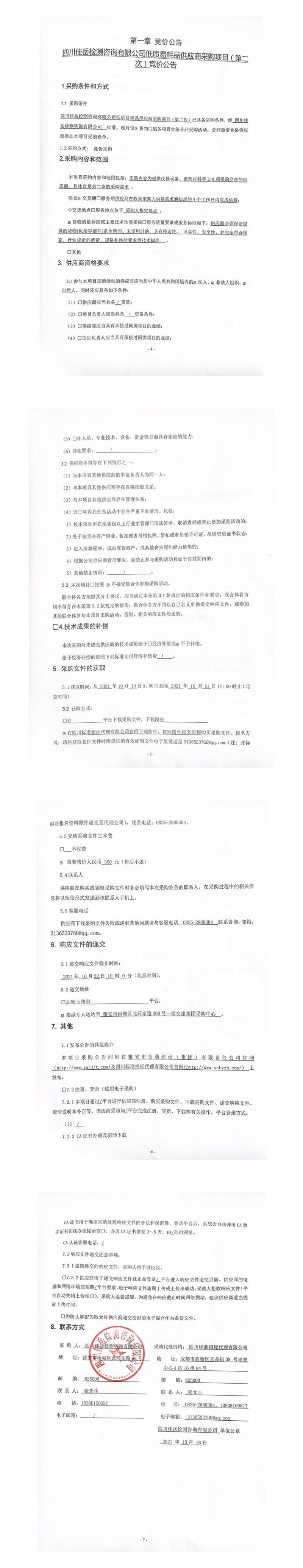 四川佳岳檢測咨詢有限公司低質易耗品供應商采購項目(第二次)競價公告