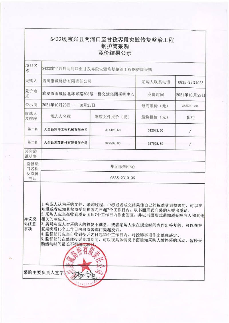 四川康藏路橋有限責任公司S432線寶興縣兩河口至甘孜界段災(zāi)毀修復整治工程鋼護筒采購競價結(jié)果公示