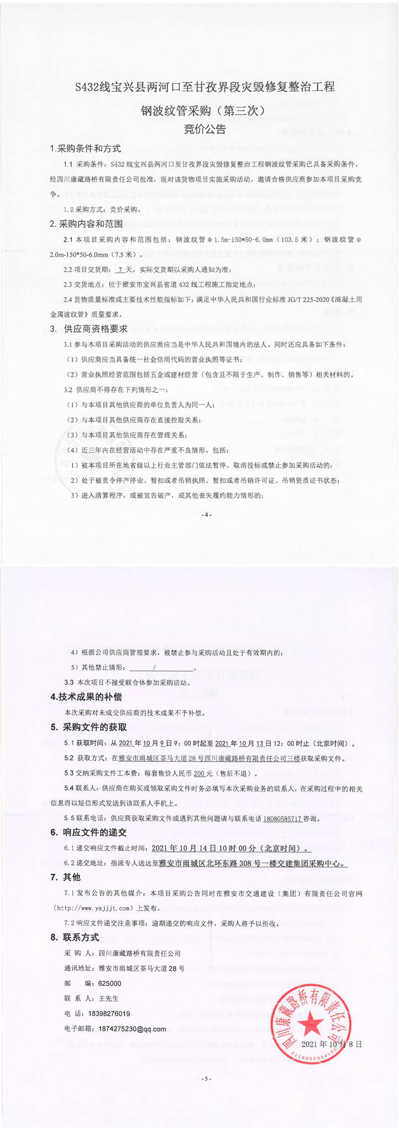 四川康藏路橋有限責任公司S432線寶興縣兩河口至甘孜界段災毀修復整治工程鋼波紋管采購(第三次)競價公告