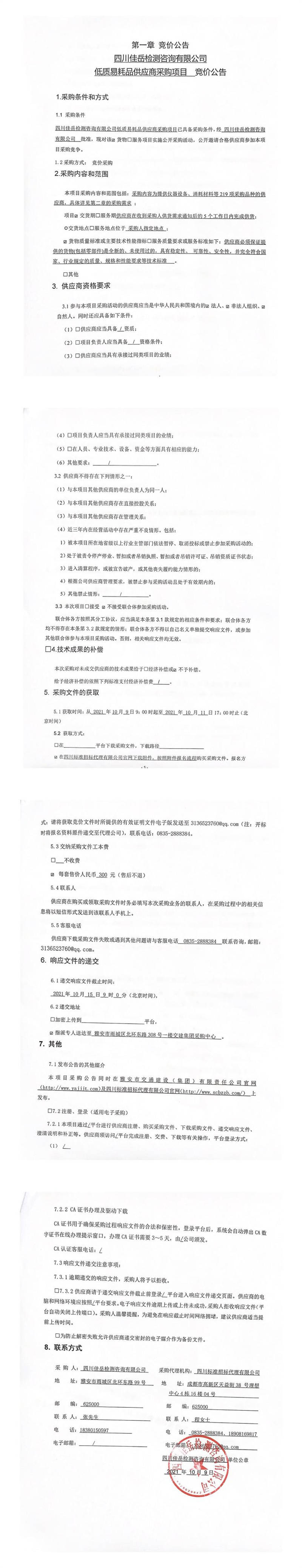 四川佳岳檢測咨詢有限公司低質易耗品供應商采購項目競價公告
