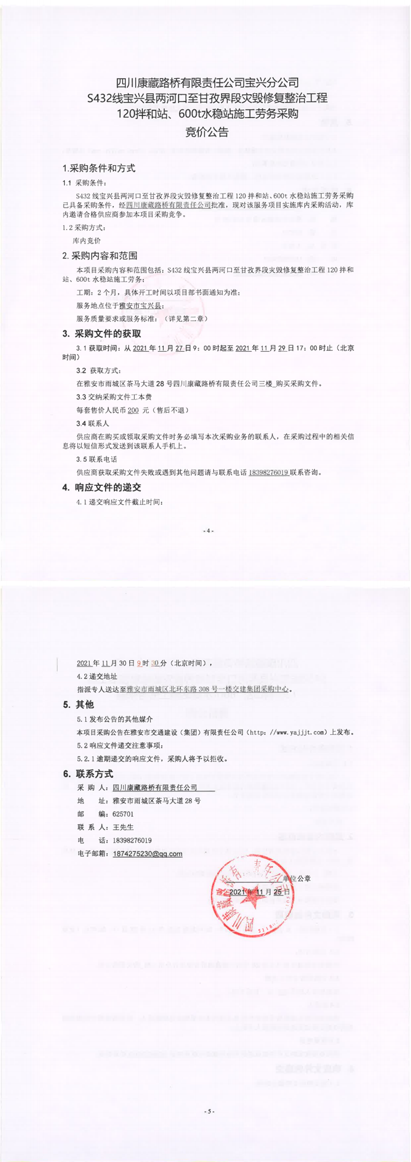 四川康藏路橋有限責(zé)任公司S432線(xiàn)寶興縣兩河口至甘孜界段災(zāi)毀修復(fù)整治工程120拌合站、600t水穩(wěn)站施工勞務(wù)采購(gòu)競(jìng)價(jià)公告
