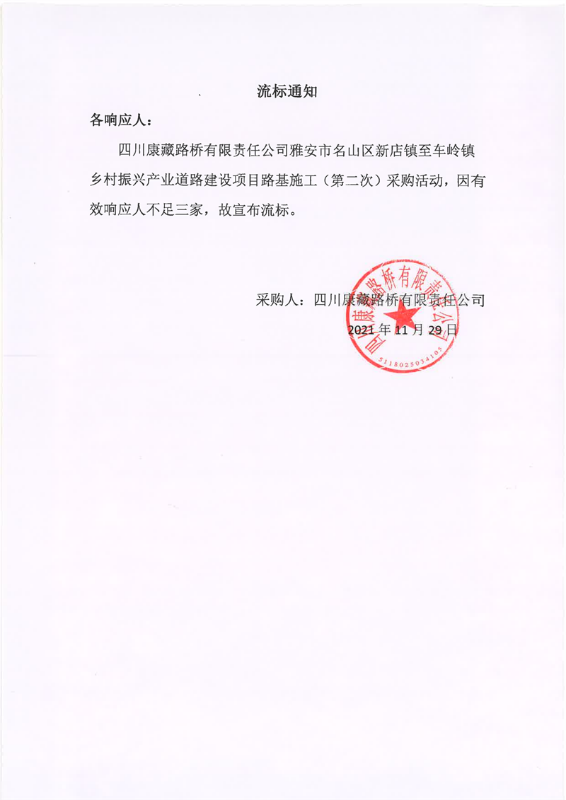 四川康藏路橋有限責(zé)任公司雅安市名山區(qū)新店鎮(zhèn)至車嶺鎮(zhèn)鄉(xiāng)村振興產(chǎn)業(yè)道路建設(shè)項(xiàng)目路基施工(第二次)流標(biāo)通知