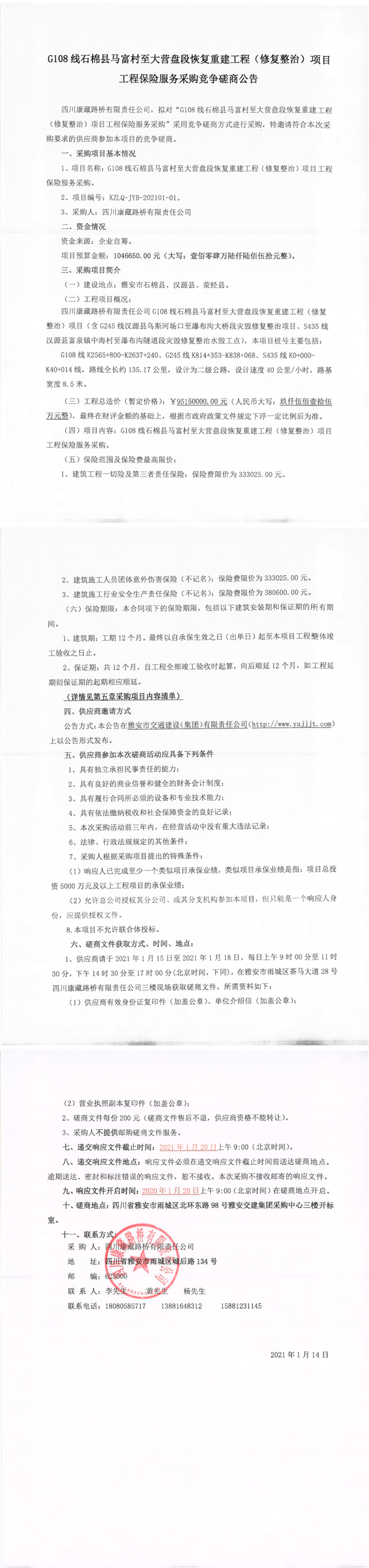 四川康藏路橋有限公司G108線石棉縣馬富村至大營盤段恢復(fù)重建工程(修復(fù)整治)項(xiàng)目工程保險(xiǎn)服務(wù)采購競(jìng)爭(zhēng)磋商公告