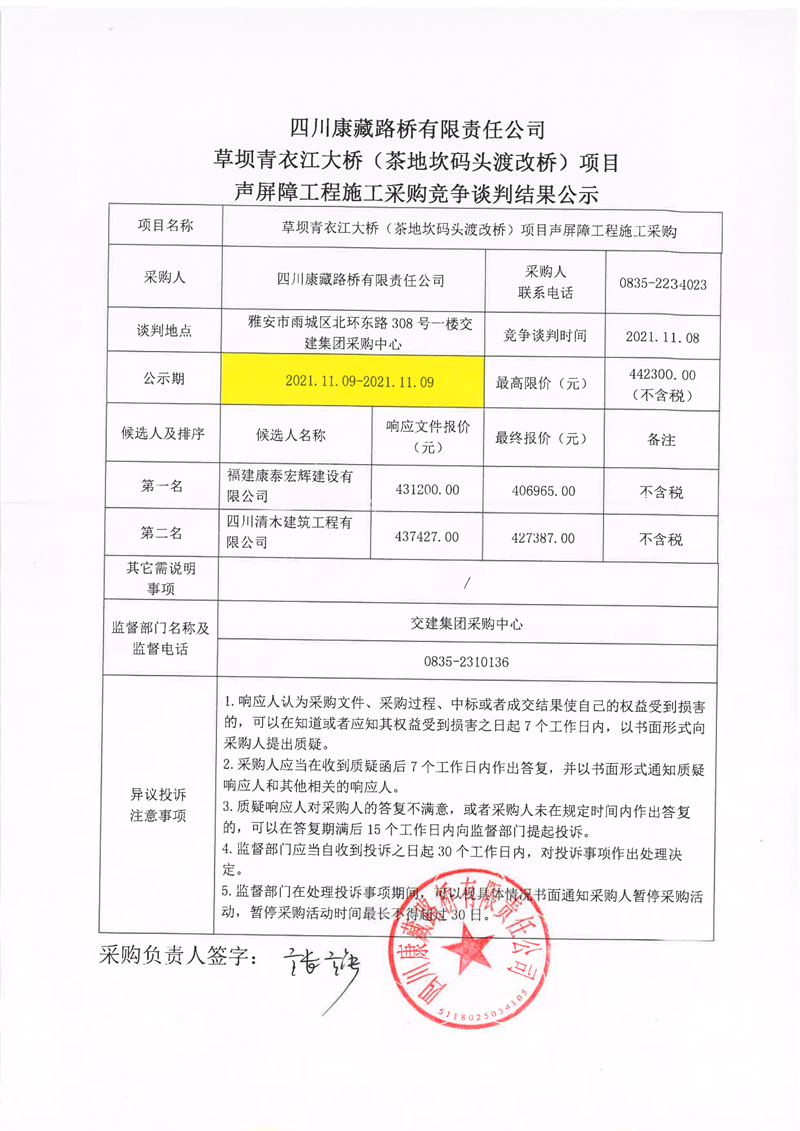四川康藏路橋有限責(zé)任公司草壩青衣江大橋(茶地坎碼頭渡改橋)項(xiàng)目聲屏障工程施工采購(gòu)競(jìng)爭(zhēng)談判結(jié)果公示