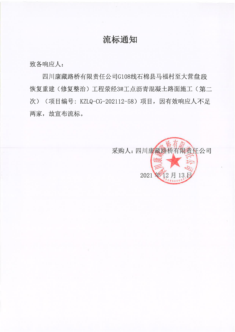 四川康藏路橋有限責(zé)任公司G108線石棉縣馬福村至大營盤段恢復(fù)重建(修復(fù)整治)工程滎經(jīng)3#工點瀝青混凝土路面施工(第二次)流標(biāo)通知
