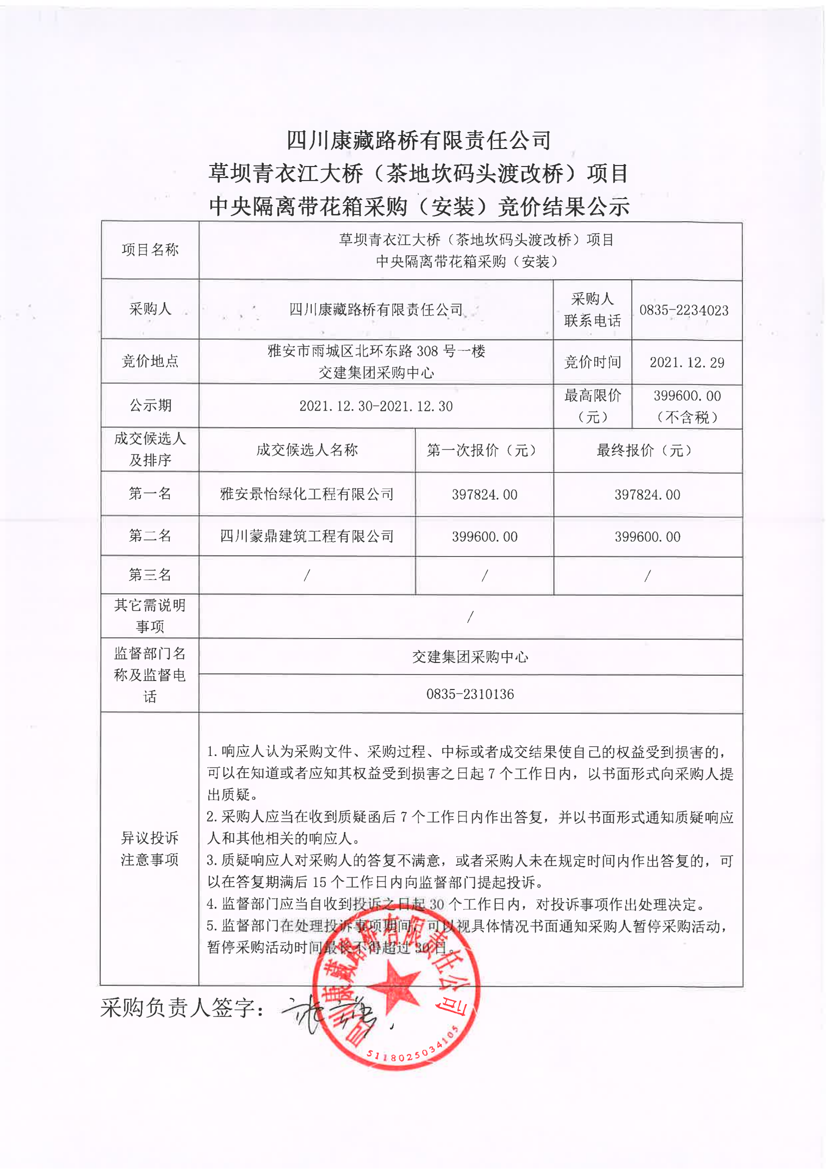 四川康藏路橋有限責(zé)任公司草壩青衣江大橋(茶地坎碼頭渡改橋)項目中央隔離帶花箱采購(安裝)競價結(jié)果公示