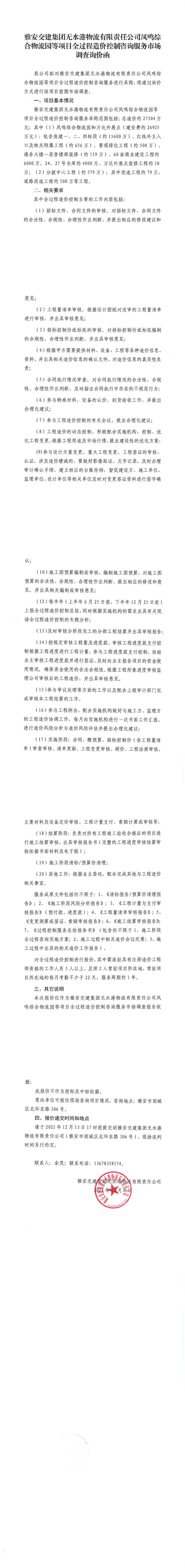 雅安交建集團無水港物流有限責(zé)任公司鳳鳴綜合物流園等項目全過程造價控制咨詢服務(wù)市場調(diào)查詢價函