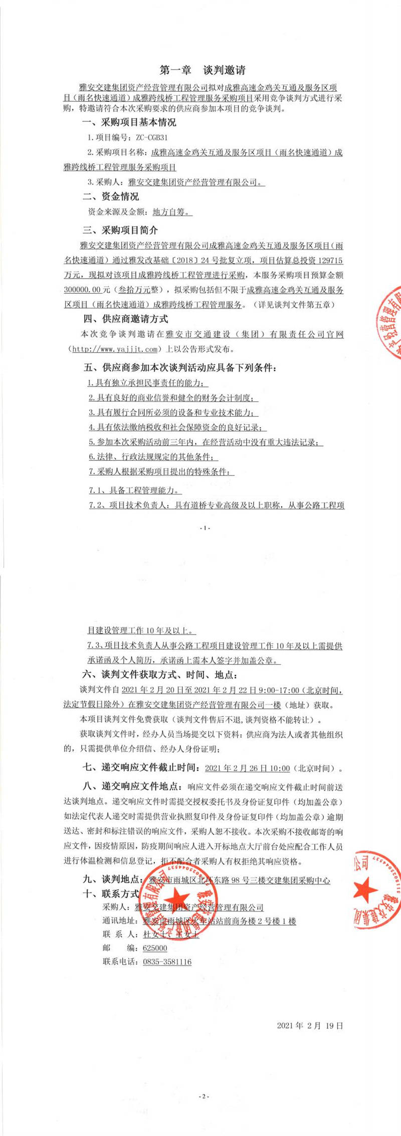 雅安交建集團(tuán)資產(chǎn)經(jīng)營管理有限公司成雅高速金雞關(guān)互通及服務(wù)區(qū)項(xiàng)目(雨名快速通道)成雅跨線橋工程管理服務(wù)采購項(xiàng)目競(jìng)爭(zhēng)談判公告