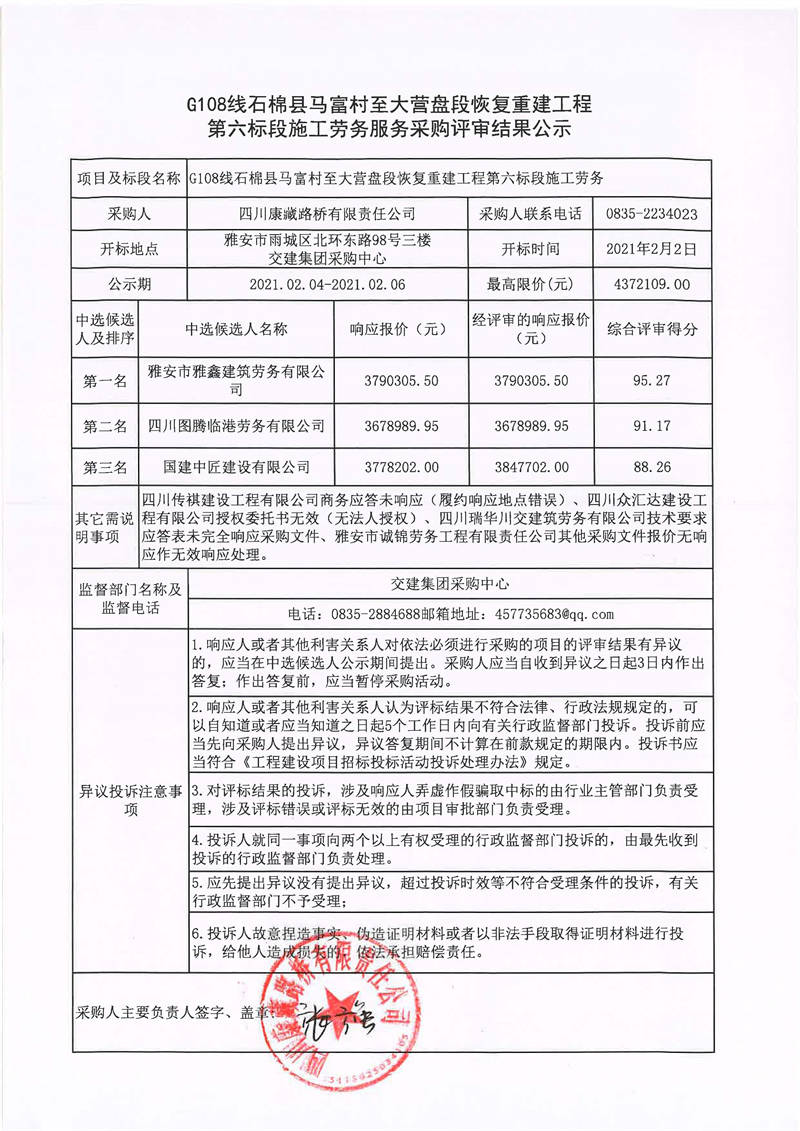 四川康藏路橋有限責(zé)任公司G108線石棉縣馬富村至大營盤段恢復(fù)重建工程第六標(biāo)段施工勞務(wù)服務(wù)采購評(píng)審結(jié)果公示