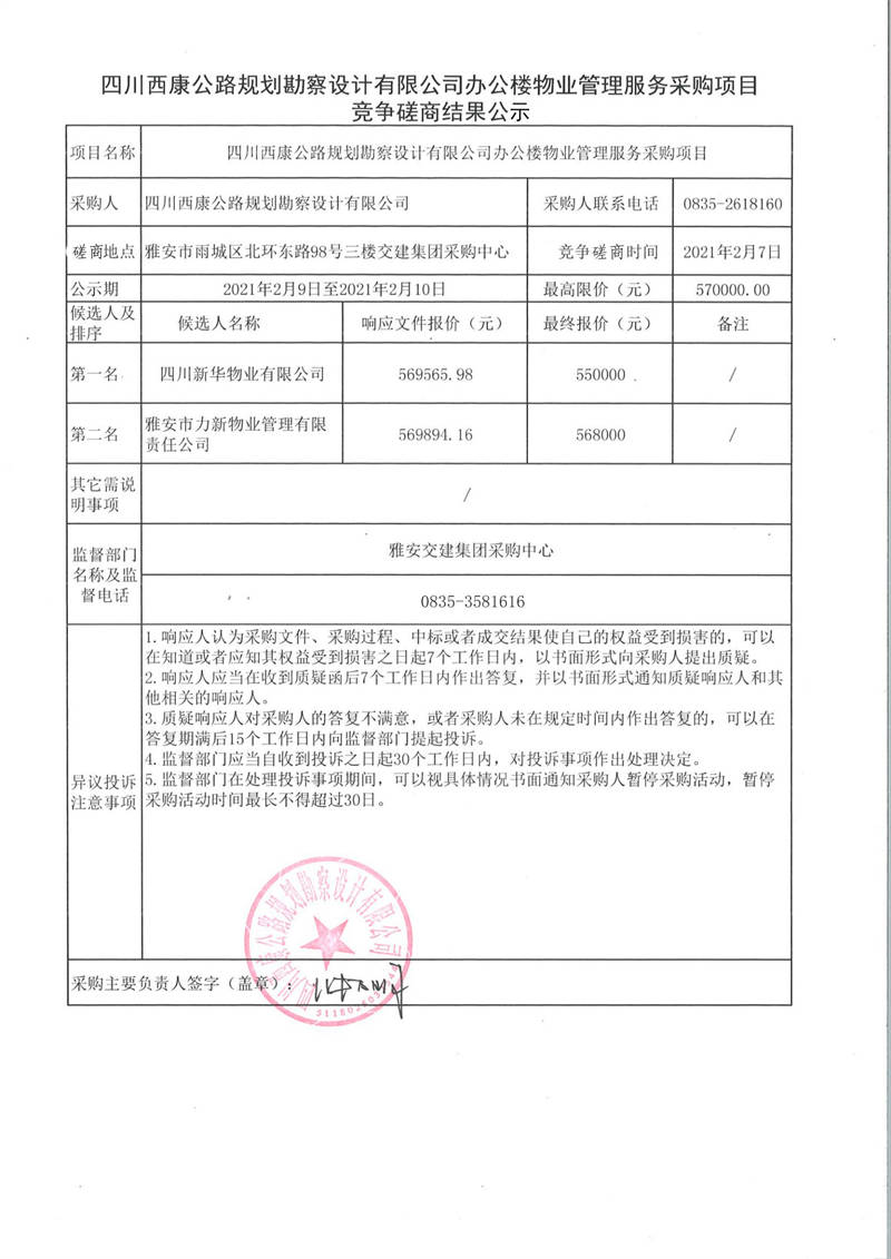 四川西康公路規(guī)劃勘察設計有限公司辦公樓物業(yè)管理服務采購項目競爭磋商結果公示