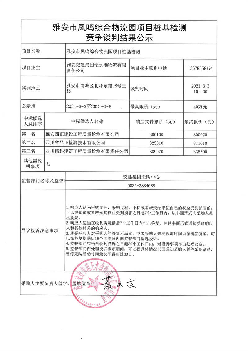 雅安交建集團無水港物流有限責(zé)任公司雅安市鳳鳴綜合物流園項目樁基檢測競爭談判結(jié)果公示